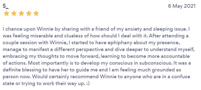I felt a clear improvement in my everyday wellbeing after attending the therapy session. I used to experience an ongoing sense of unease and discomfort, especially towards a particular relationship in my life that I felt was holding me back from moving forward in my everyday endeavours. But these difficult feelings subsided significantly after a session with Winnie. I've since become far more productive and focussed in my work, approaching many of my commitments with far less resistance, as well as greater ease.