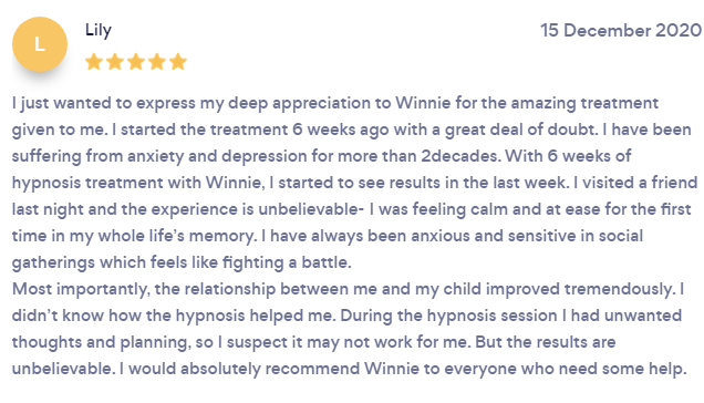 I recalled hearing about Winnie's work hence I sought her help. It cannot be happier when I see my daughter healed after the hypnosis sessions, and become happier again. She has also found her career path coaching with Winnie.